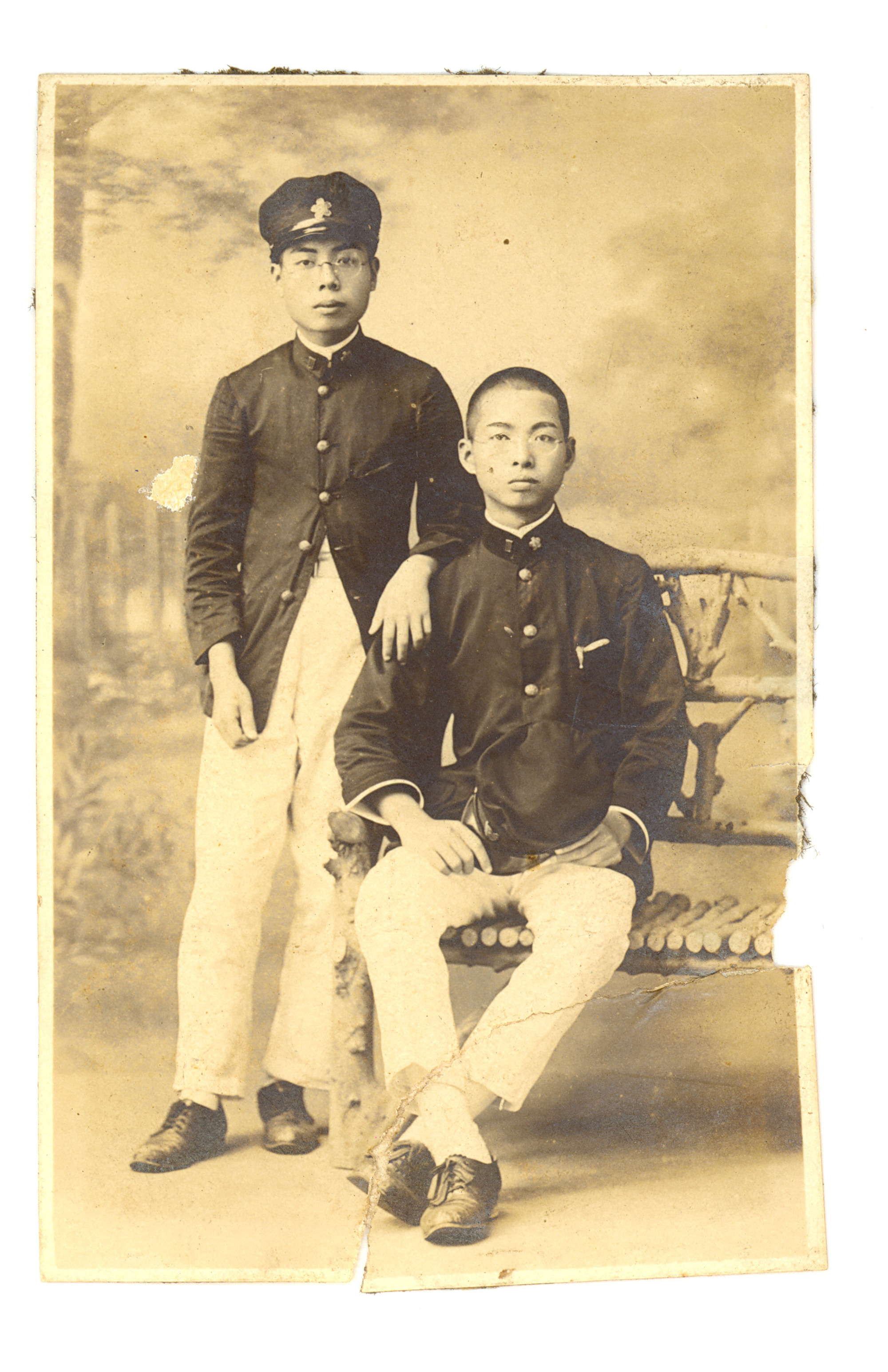 鄧雨賢(右)就讀臺北師範學校時期與同班同學陳運旺先生合照於校園內(版本一)