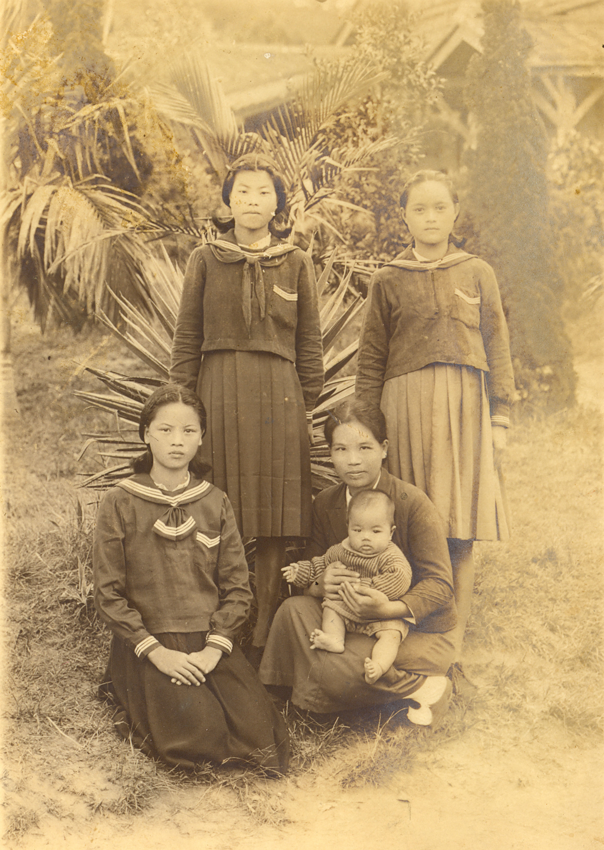 鍾有妹抱著未滿周歲的幼子(鄧健作)與學生校園剪影,拍攝於辦公室前